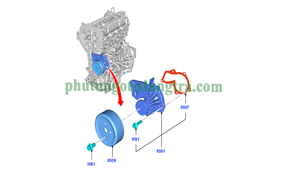 2. Cấu tạo: Bơm nước Ford Focus có cấu tạo gồm , 1 phần vỏ, 2 phần cánh quạt được kết nối với trục bơm và trục boem được kết nối với puli bơm nước thông qua 4 con ốc vặn ( như trên sơ đồ kĩ thuật mã 8501 ).