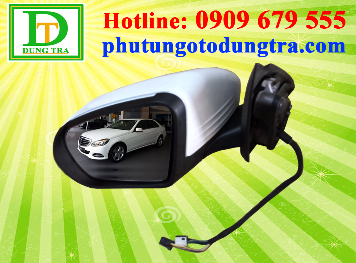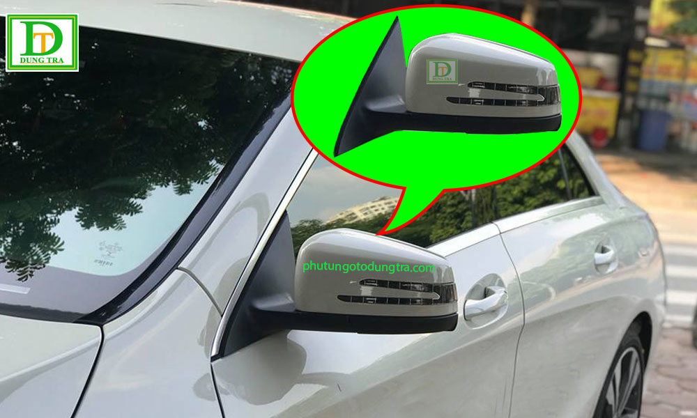 - Cấu tạo Kính chiếu hậu Mercedes-Benz E200: Bao gồm 1 mặt gương, 1 ốp sau gương mạ xi crom, thân gương ,1 motor điều chỉnh mặt gương, 1 motor gập gương khi xe đỗ và đặc biệt có tích hợp 1 xi nhan báo rẽ trên gương,cảnh báo điểm mù trên gương, đèn mở cửa trên gương...