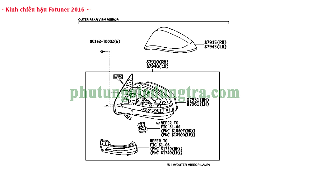 Kính chiếu hậu Toyota Fotuner 2016~ hay còn gọi là gương chiếu hậu Toyota Fotuner 2016~ là một sản phẩm có mã ( 87910 trên sơ đồ kĩ thuật ) .